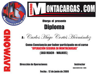 Al final de cada curso y a los operadores que pasen el examen se les da un DIPLOMA de CERTIFICACIÓN DE OPERADOR DE MONTACARGAS CAPACITADO.